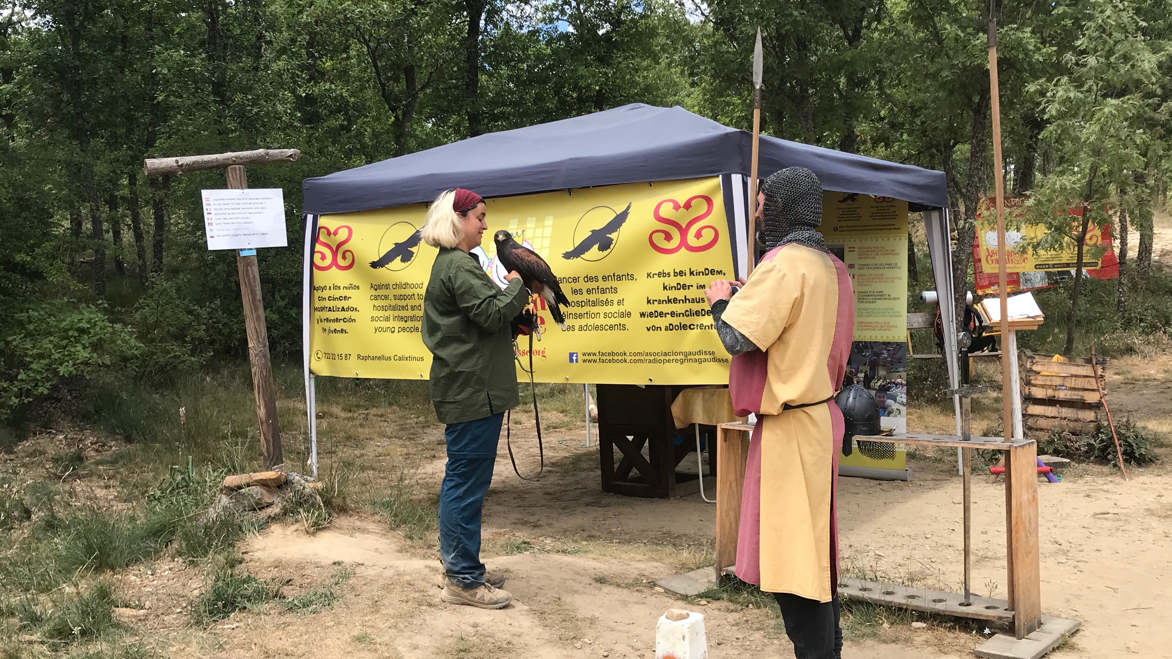 鎖かたびらに十字のコスプレをしたシニョールが、鷹と一緒の写真を撮って、スタンプを押してくれている。